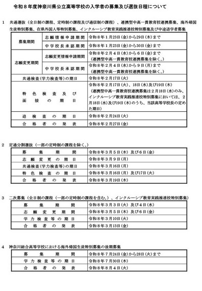 第1次募集、連携型選抜、全国募集選抜の本試験日は2026年3月4日。国語・社会・数学・英語・理科の5教科の学力検査を行う。学校によっては、面接・実技・作文のいずれかを実施する場合がある。追試験は3月10日、合格発表は3月16日。合格者数が募集定員に満たない高校では、3月23日に第2次募集の学力検査などを実施する。