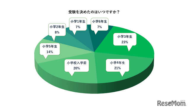 「受験を決めたのはいつですか?」という質問に対しては、小学校3年生が23%、4年生が21%、小学校入学前が20%だった。全体の58%、約6割近くが小学校3年生までに受験を決めたという結果となっている。