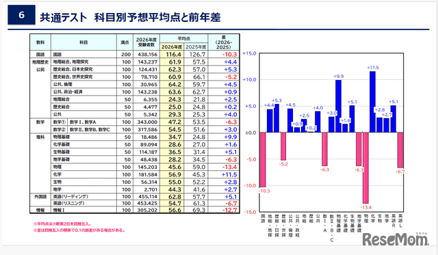 また、「物理」は難化し、平均点が13.4点下がりました。一方で「化学」は11.5点上昇しています。理系では物理と化学を併せて受験する受験生が多いため、この2科目間である程度はバランスが取られた面があります。