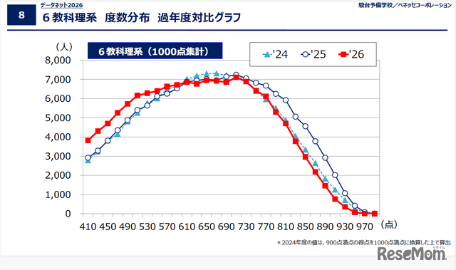 さらに理系では昨年と比べて700点以上の高得点層が文系以上に減少しています。また600点以下の下位層が2024年度、2025年度と比べてもかなり増加しましたので、文系以上に難化したといえます。
