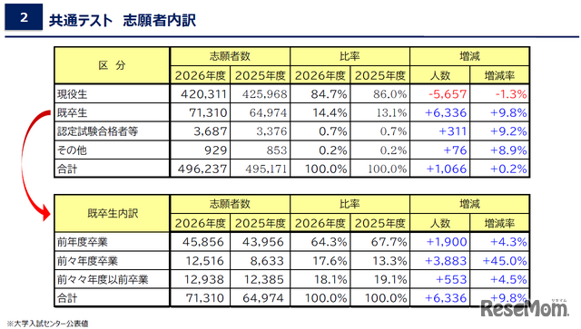 2026年度の共通テスト志願者数は49万6,237人で、昨年から1,066人増えました。全体としては2025年度とほぼ同水準です。内訳を見ると、現役生は42万311人で前年から5,657人減少し、既卒生は7万1,310人で6,336人増加しました。現役生が減った背景としては、18歳人口がそれほど変わっていないものの共通テスト離れが進んでいることや、年内入試の広がりが影響していることが考えられます。