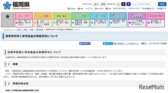 【高校受験2018】福岡県、入学支度金の貸与時期を入学前に変更 1枚目の写真・画像