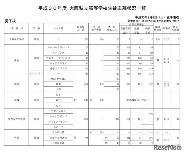 平成30年度 大阪私立高等学校生徒応募状況一覧(一部)