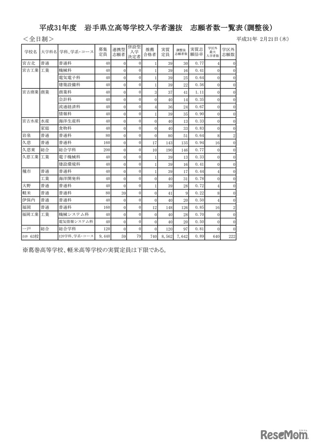 平成31年度 岩手県立高等学校入学者選抜 志願者数一覧表(調整後)・全日制(3/3)