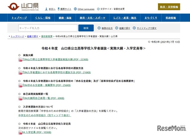 2022年度山口県公立高等学校入学者選抜<実施大綱・入学定員等>