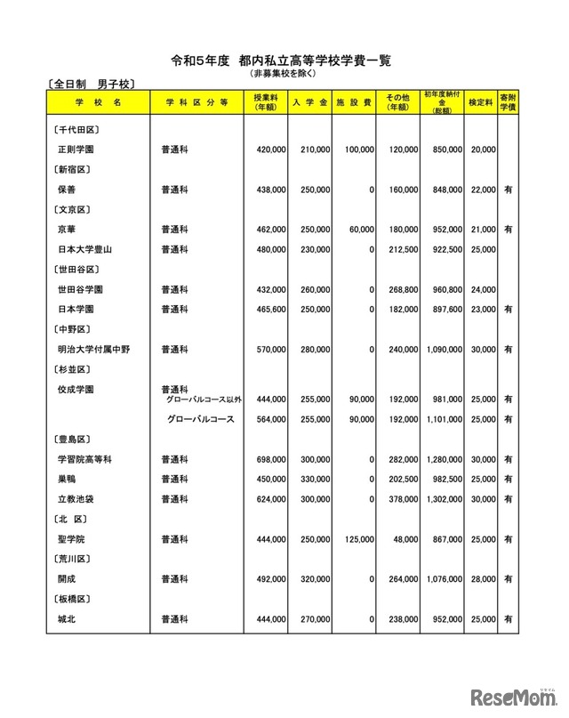 画像出典:東京都生活文化スポーツ局「令和5年度 都内私立高等学校学費一覧(非募集校を除く)」
