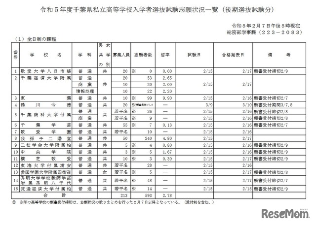 2023年度千葉県私立高等学校入学者選抜試験志願状況一覧(後期選抜試験分)全日制課程(2023年2月7日午後5時現在)
