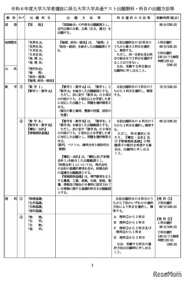 2024年度大学入学者選抜に係る大学入学共通テスト出題教科・科目の出題方法