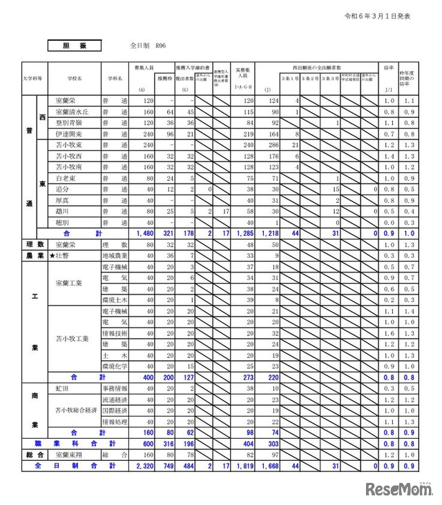 画像出典:北海道教育委員会「令和6年度公立高等学校入学者選抜 再出願後の出願状況」