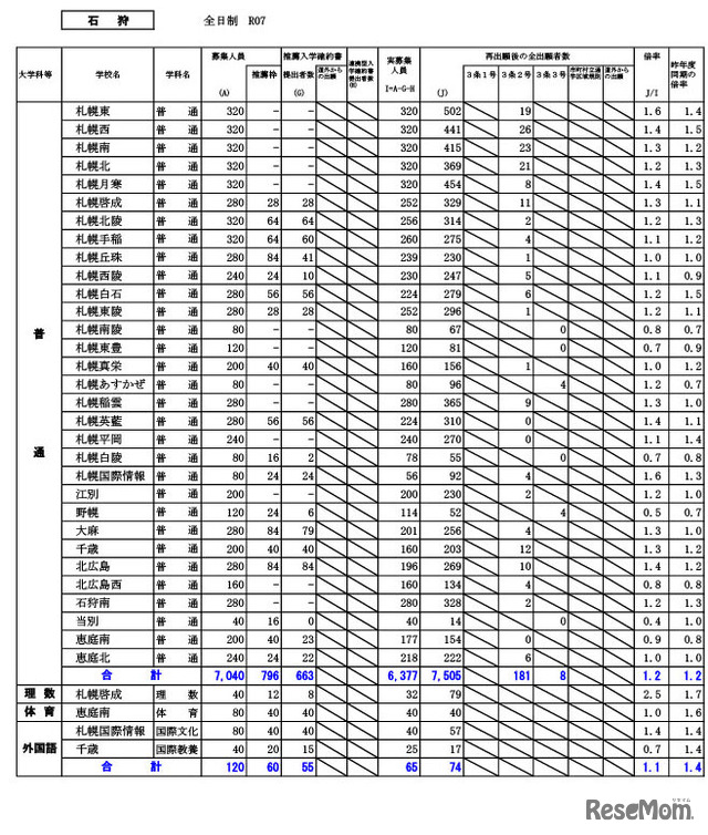 画像出典:北海道教育委員会「令和7年度(2025年度)公立高等学校入学者選抜【再出願後の出願状況】」