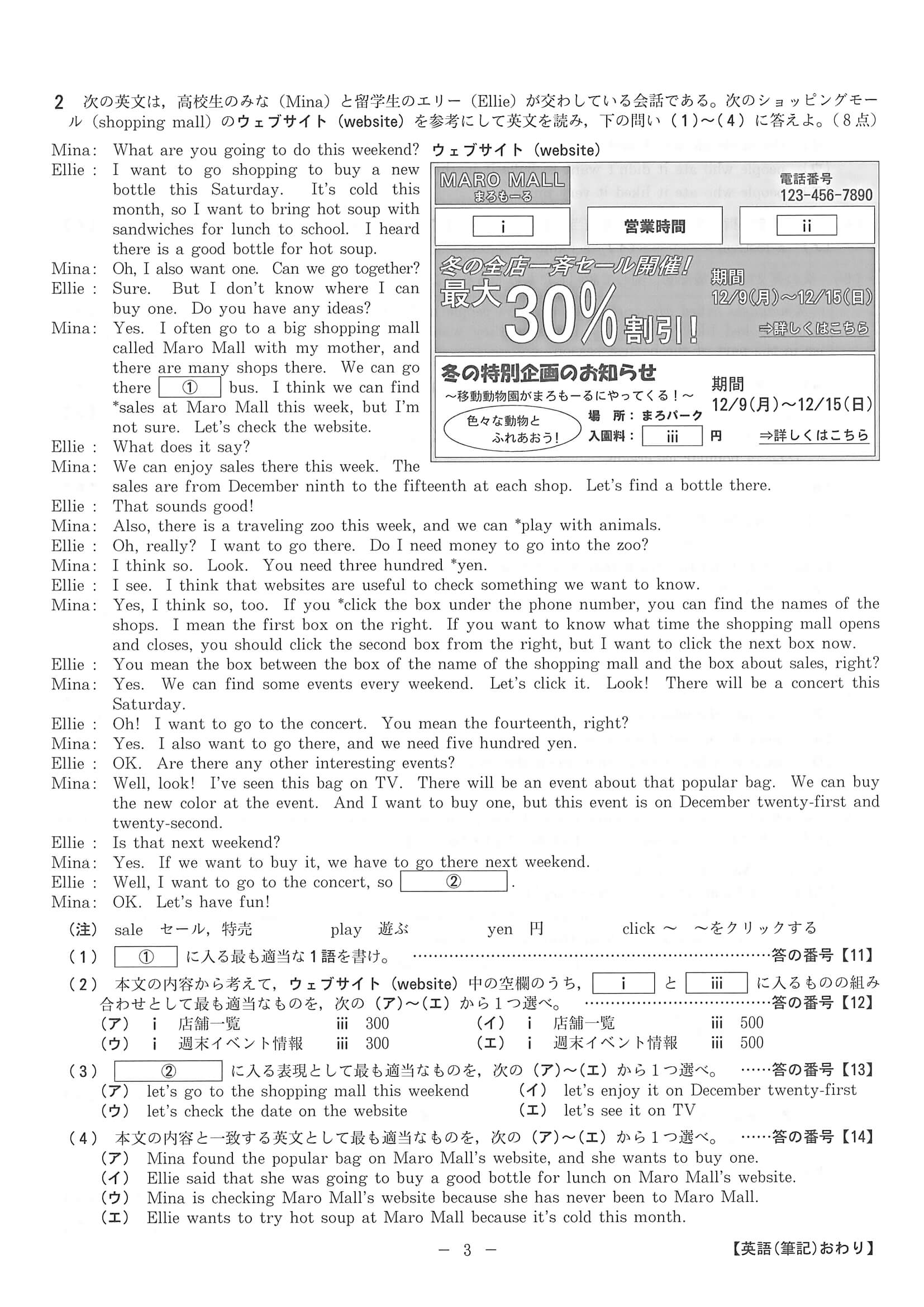 2020年度 京都府 公立高校入試[中期選抜 英語・問題]3/3