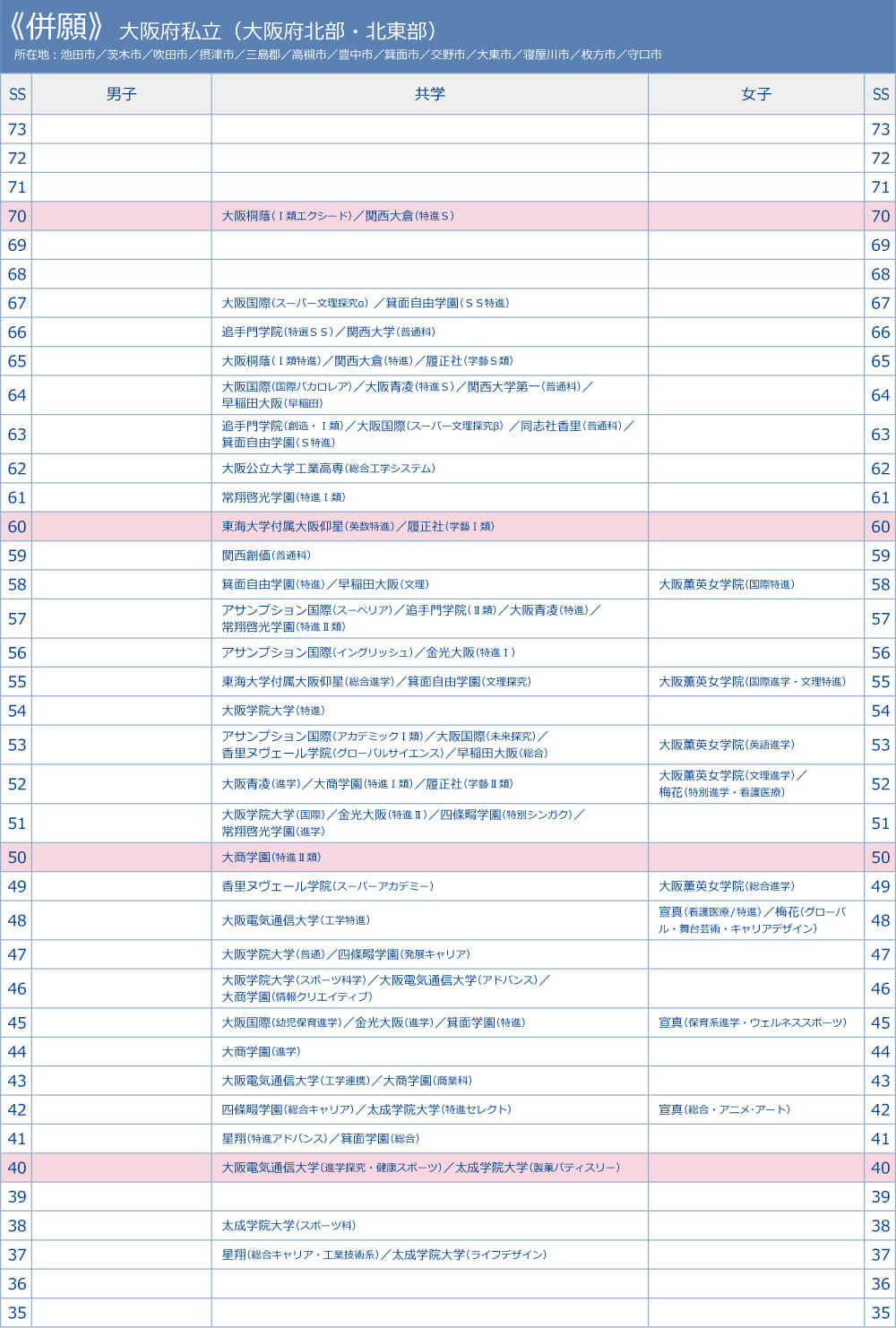 高校偏差値 大阪府 私立校 大阪府北部・北東部 併願