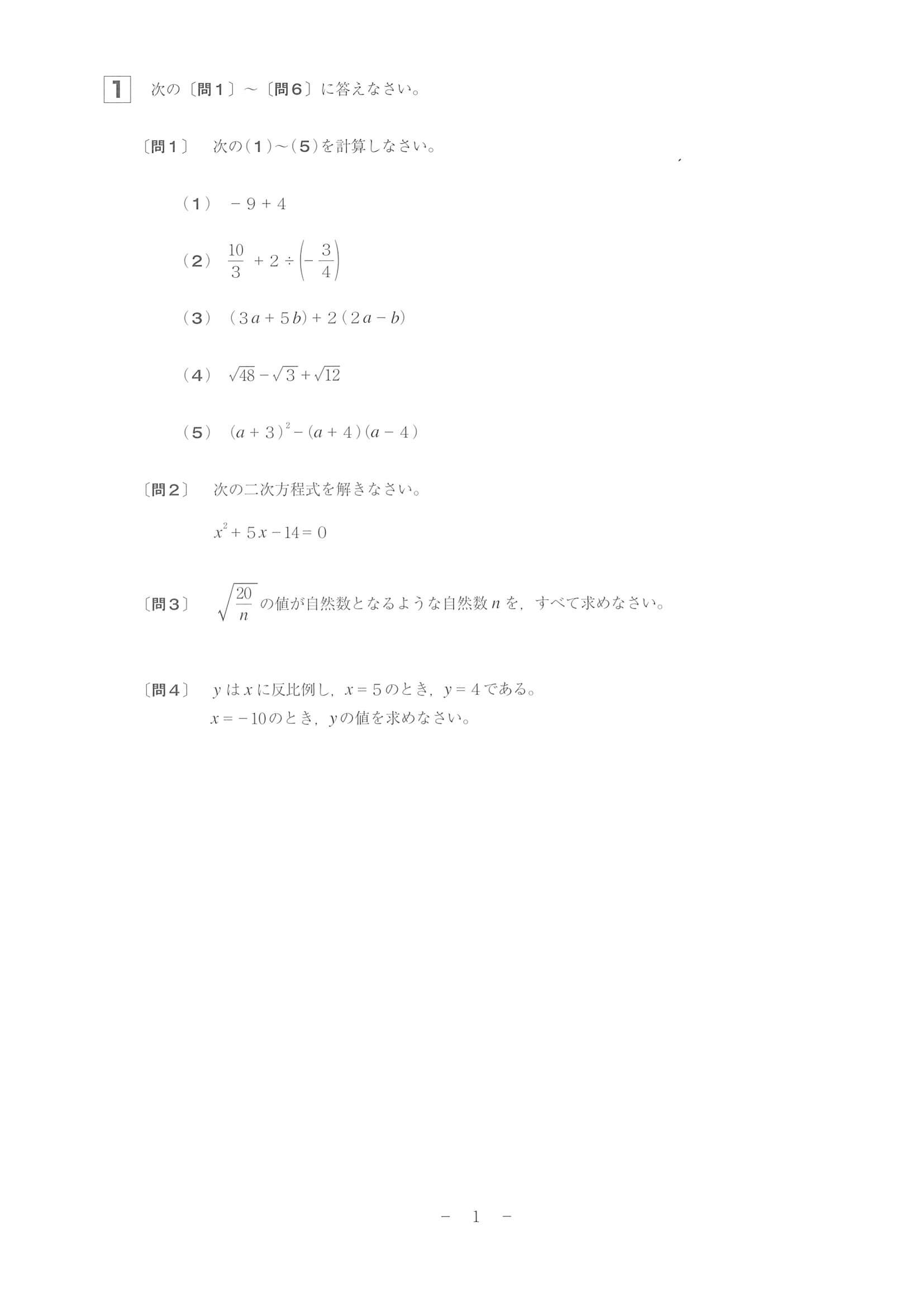 2022年度 和歌山県公立高校入試[標準問題 数学・問題]1/6